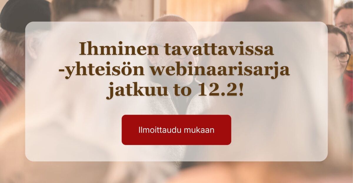 Helmikuussa aloittavien Ihminen tavattavissa -kasvuryhmien hakuaika on päättymässä pian – 25.1.2026! Täydellistä hetkeä ei tule, mutta hetki voi silti olla juuri oikea. Jos tunnet ohjelman kutsuvan, laita hakemus sisään ja voit vielä haastattelun jälkeen päättää, lähdetkö lopulta mukaan (tällöin maksettavaksi jää vain 150 euron haastattelumaksu). Hakemukset käsitellään ja paikat täytetään saapumisjärjestyksessä, joten jätä hakemuksesi mahdollisimman pian. Lue hakuohjeet ja jätä hakemuksesi täällä.
