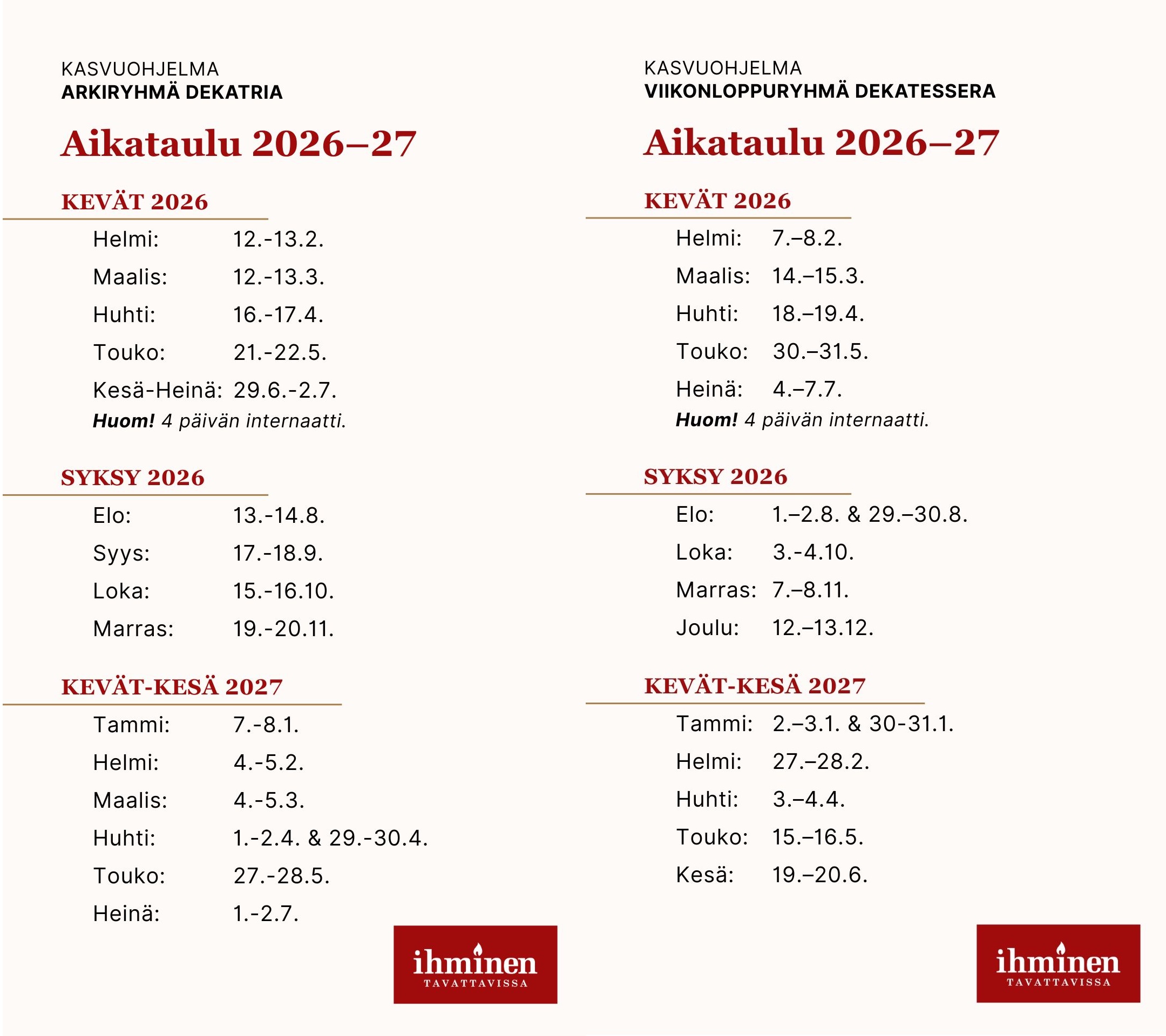 (Huom. viikonloppuryhmä Dekatesseran aikataulua on korjattu 17.12.2025 ja arkiryhmä Dekatrian aikataulua on korjattu 17.12.2025. Alta löydät lopulliset aikataulut.)